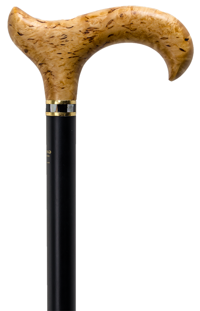 Dieser in aufwendiger Handarbeit hergestellte PREMIUM-Gehstock vereint pure Eleganz mit zeitlosen Chic. Der elegant geschwungene und ergonomisch geformte L-DERBY-Griff aus exklusivem und einzigartig in naturfarben gemasertem Maserbirkenholz ist für beide Handseiten geeignet, kann durch seine abgerundete Nase bei Bedarf auch schnell über den Arm gehängt werden und besticht zusätzlich mit seinem breiterem Griffrücken und der somit größeren Grifffläche. Dieser Griff wird durch eine spezielle Handpolitur veredelt und versiegelt wodurch die wunderschöne Maserung noch besser zum Vorschein kommt und aufgesetzt auf einenen stabilen Schuss aus heimischem Buchenholz welches schwarz und seidenmatt lackiert ist. Schmuckstück ist der hochwertige "ARTDECO"-Ring aus Messing, Perlmutt und Onyx der den Schaft verziert. Ein Schlank-Gummipuffer am Fuß gewährleistet eine bessere Haftung und unterstützt somit den sicheren Gang.