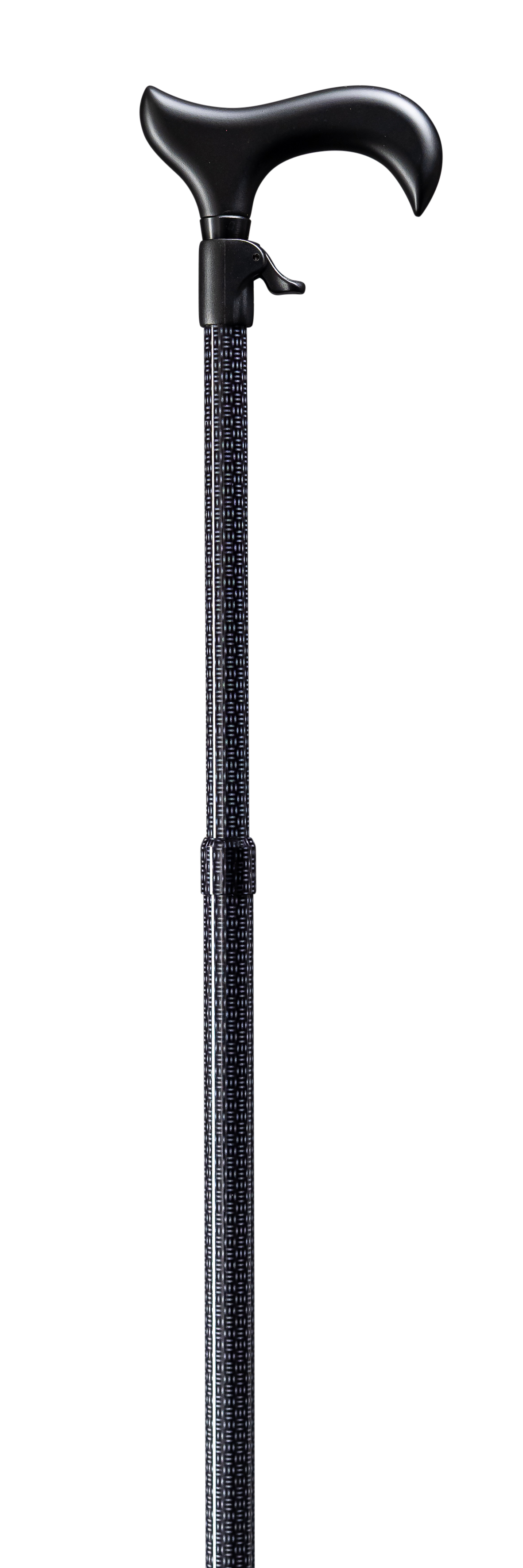 Stabiler Gehstock aus Aluminium mit DERBY-Griff aus Kunststoff. Einfach stufenlos höhenverstellbarer Schuss mit Web-Dekor und Glanz-Finish.