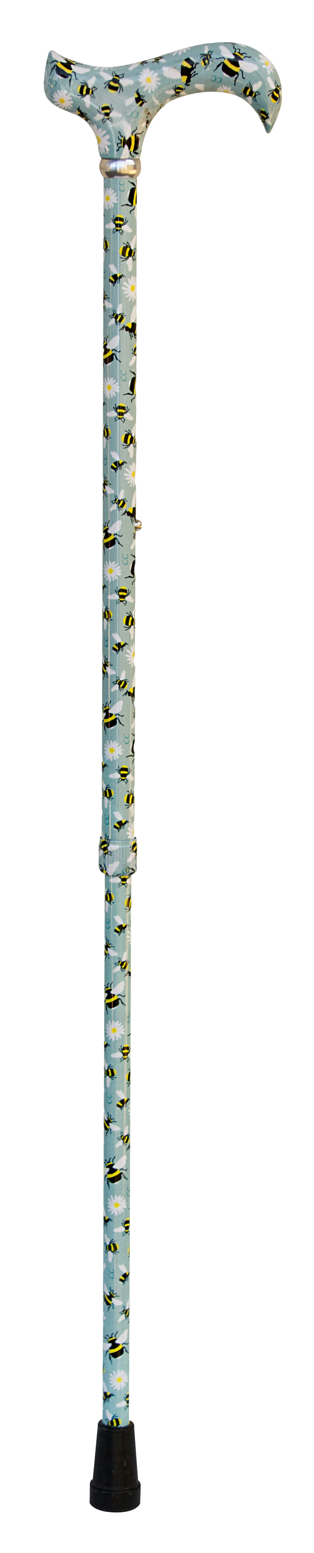 Schlanker Gehstock aus Aluminium mit DERBY-Griff aus Kunststoff. Höhenverstellbarer Schuss mit handgezeichnetem, englischem Bienen-Dekor in Glanz-Finish. Mit Chromring und Gummipuffer.