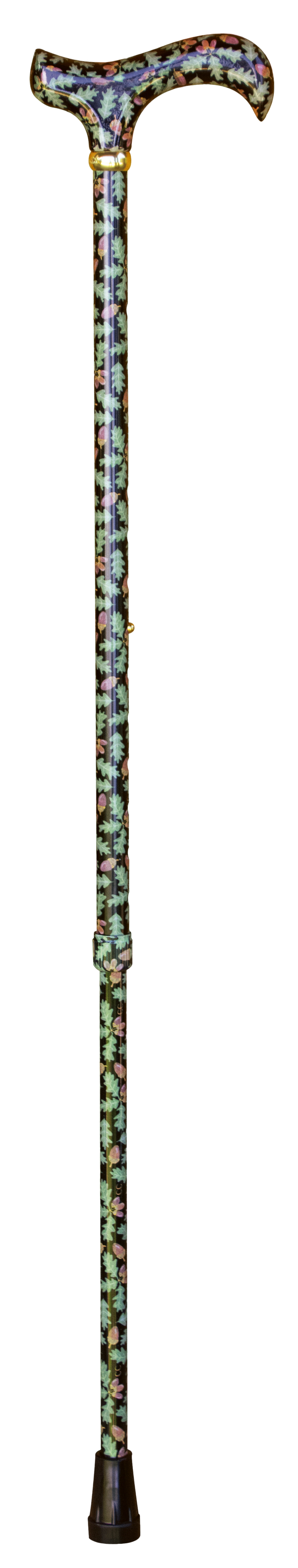 Schlanker Gehstock aus Aluminium mit DERBY-Griff aus Kunststoff. Höhenverstellbarer Schuss mit handgezeichnetem, englischem Blätter-Dekor in Glanz-Finish. Mit Messingring und Gummipuffer.