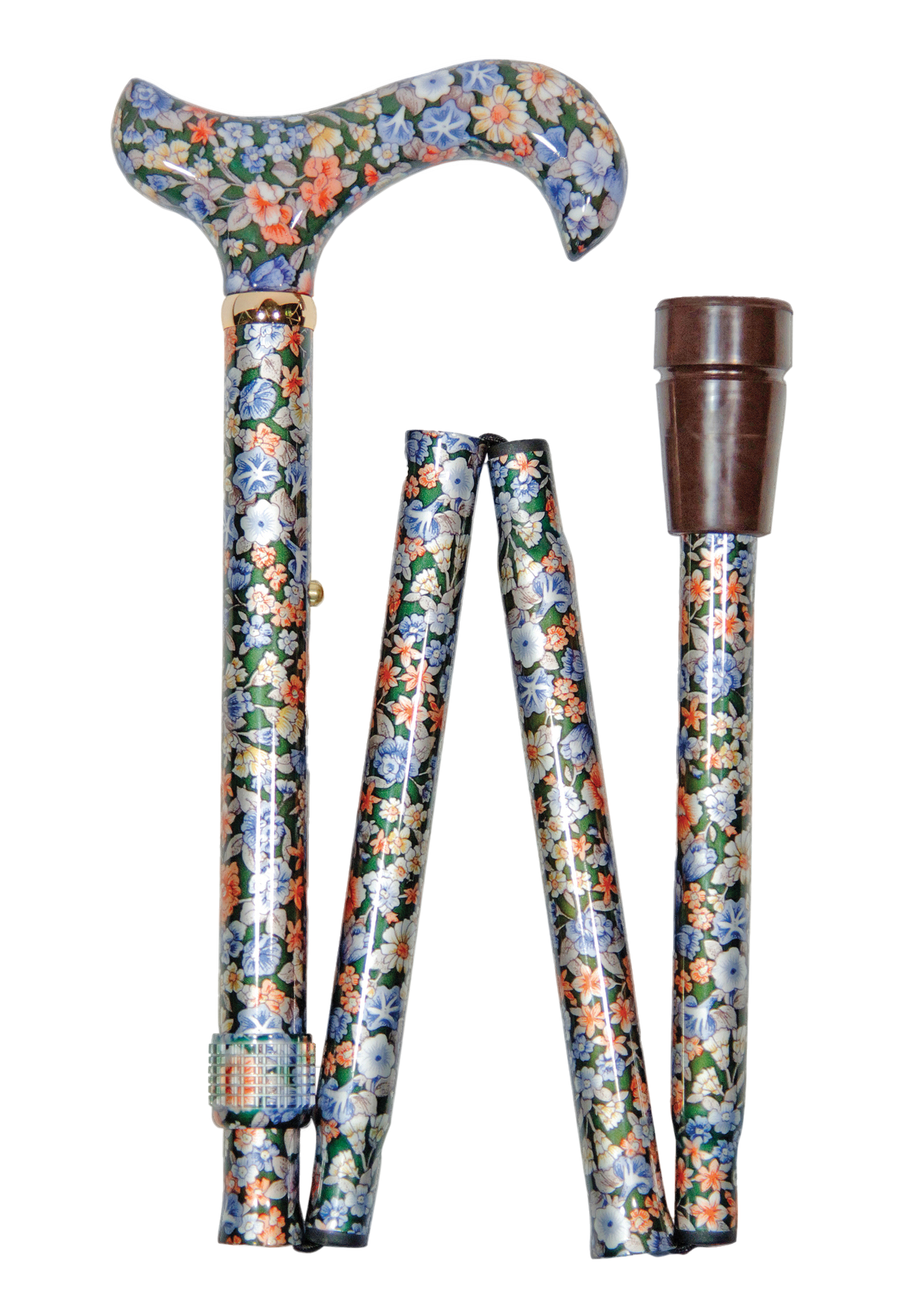 Stabiler Faltstock aus Aluminium mit bedrucktem DERBY-Griff aus Kunststoff. Höhenverstellbarer Schuss mit schlichtem englischem Blumen-Dekor in Glanz-Finish. Mit Messingring, Gummipuffer und Klarsichtetui.