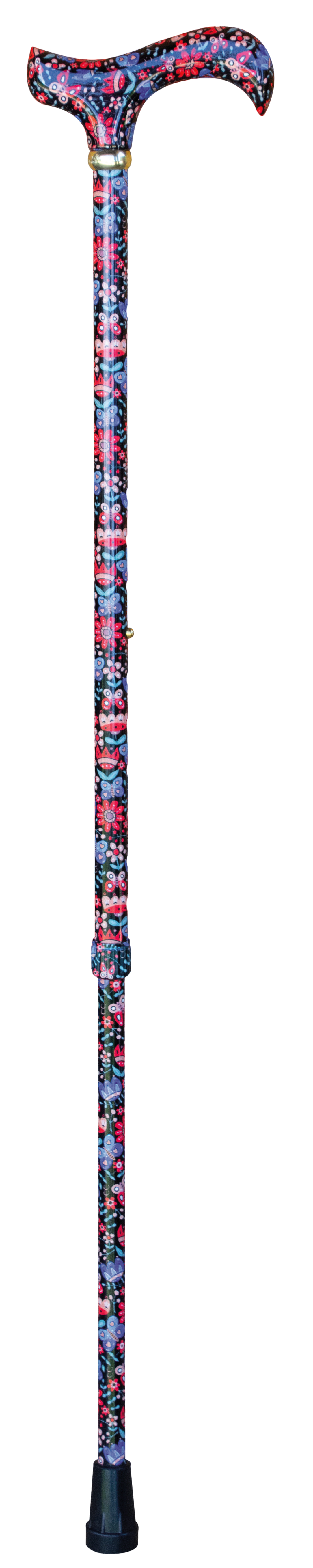 Schlanker Gehstock aus Aluminium mit DERBY-Griff aus Kunststoff. Höhenverstellbarer Schuss mit handgezeichnetem, englischem Blumen-Dekor in Glanz-Finish. Mit Messingring und Gummipuffer.