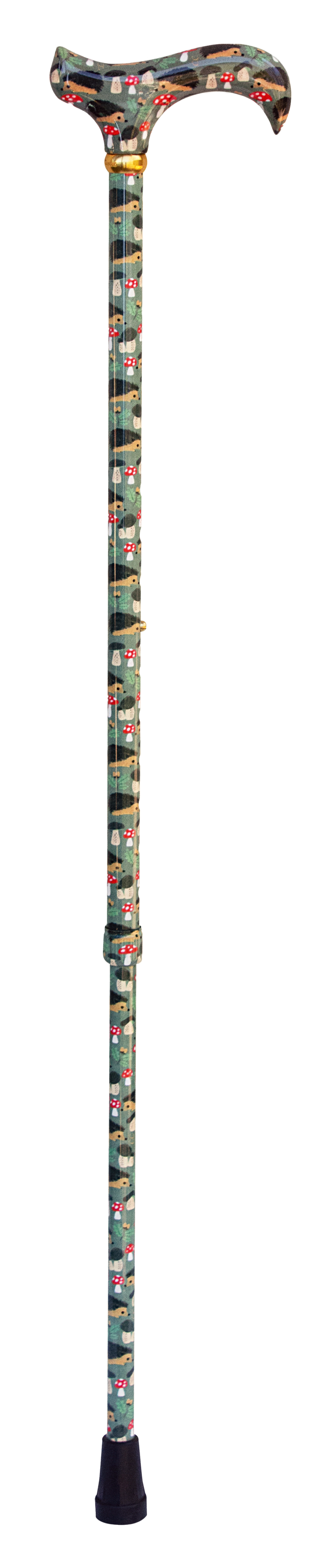 Schlanker Gehstock aus Aluminium mit DERBY-Griff aus Kunststoff. Höhenverstellbarer Schuss mit handgezeichnetem, englischem Igel-Dekor in Glanz-Finish. Mit Messingring und Gummipuffer.
