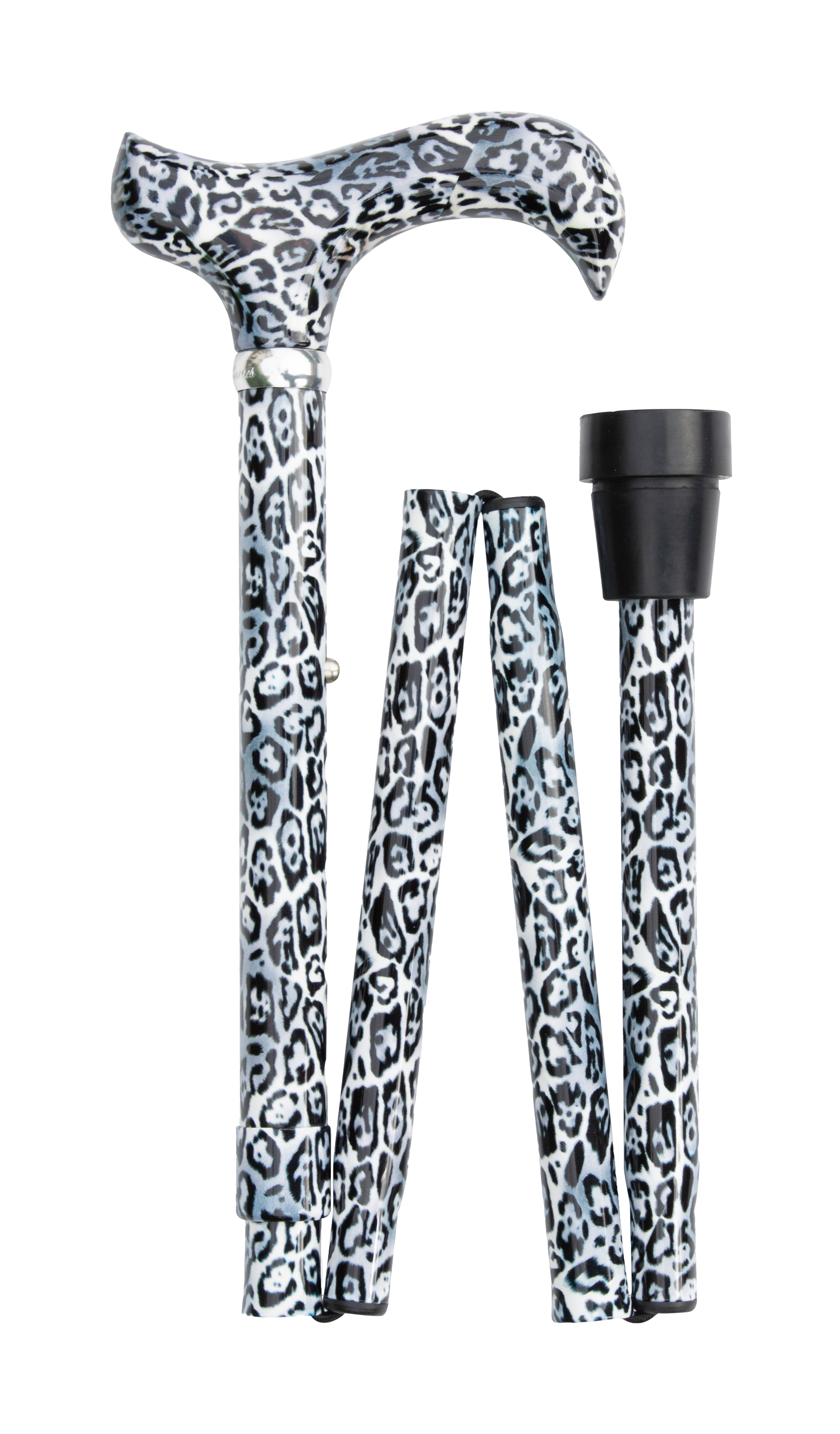 Schlanker Faltstock aus Aluminium mit DERBY-Griff aus Kunststoff. Höhenverstellbarer Schuss mit handgezeichnetem, englischem Leopard-Dekor in Glanz-Finish. Mit Chromring, Gummipuffer und Klarsichtetui.
