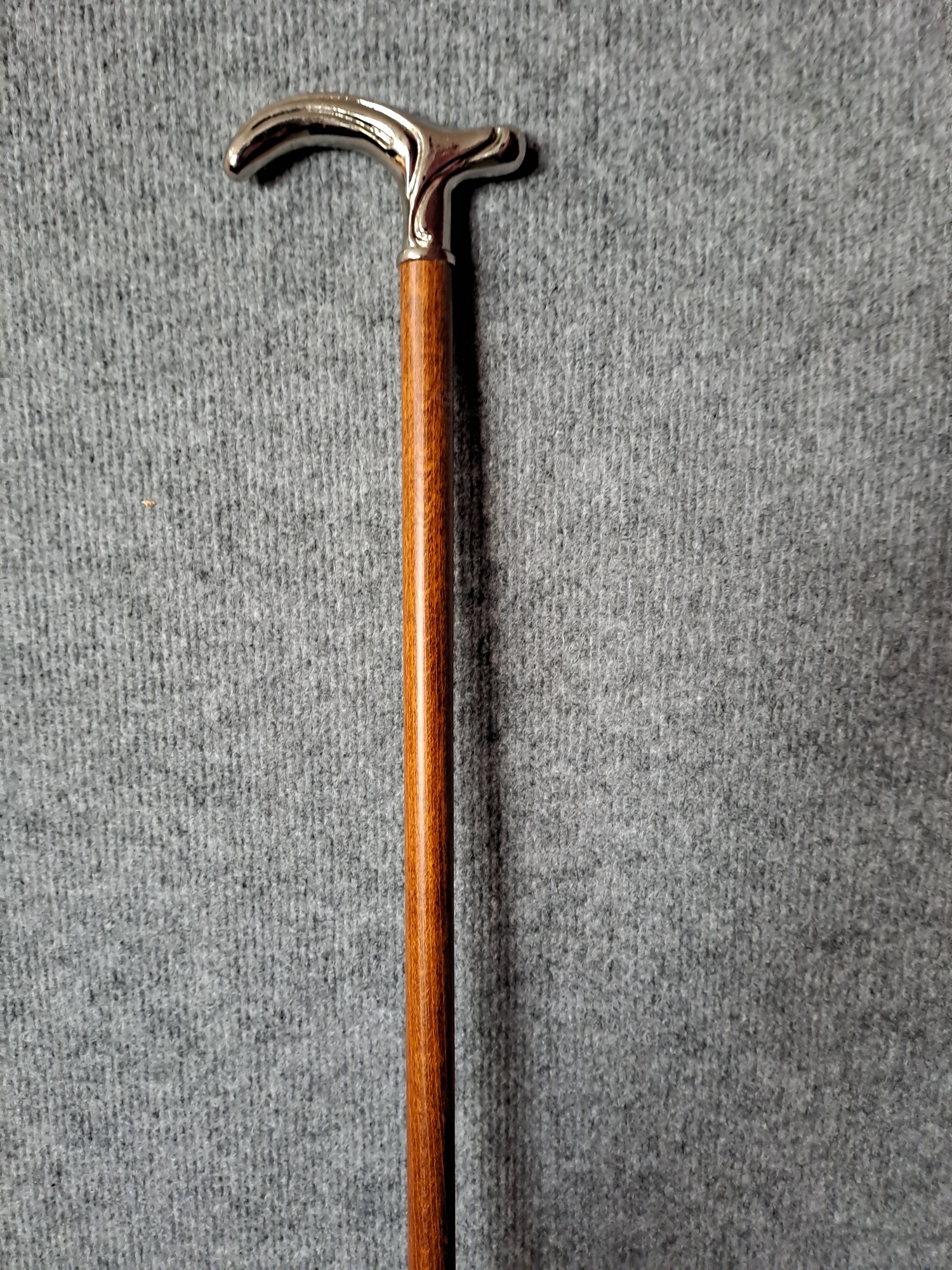 Eleganter, schlanker Stock mit zierlichem, ziseliertem DERBY-Griff im Jugendstil-Design. Griff im Kokillengussverfahren hergestellt und spiegelpoliert. Schuss schwarz seidenmatt lackiert. Mit Gummipuffer.