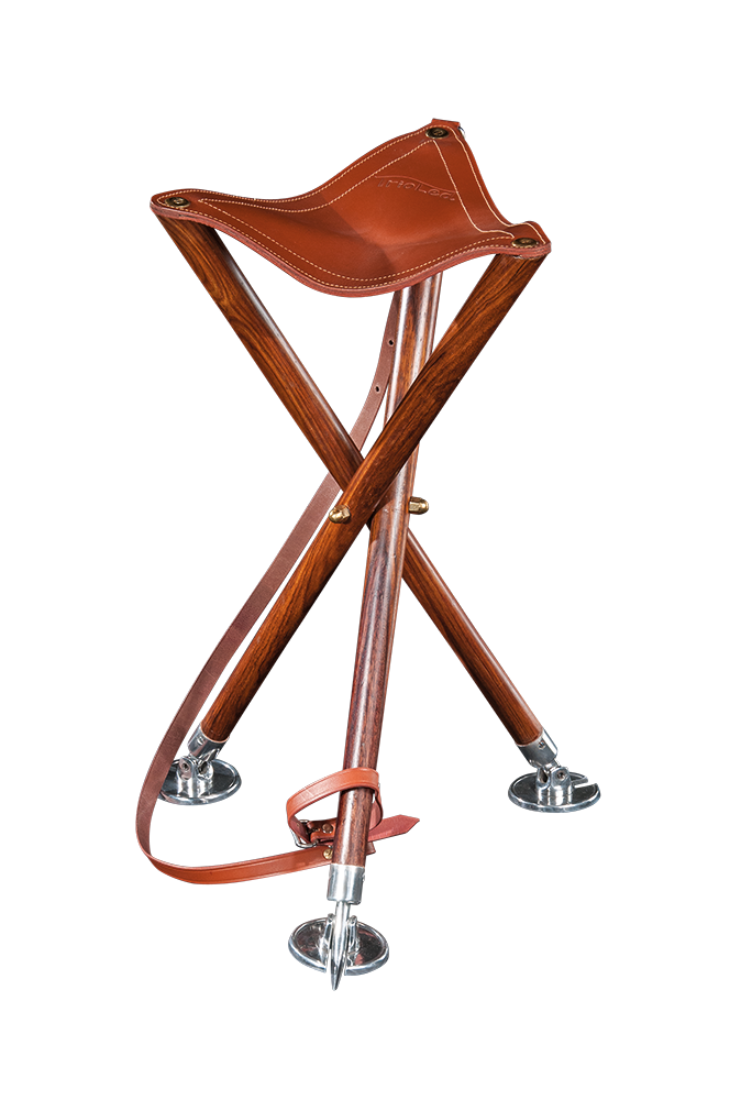 Dreibein-Ansitzstuhl mit derbem Ledersitz, Sitzhöhe ca. 65 cm, Streben aus massivem Hartholz, mit Umhängegurt aus Leder. Mit klappbaren Tellerzwingen.