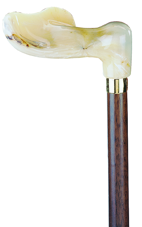Eleganter Stock aus heimischer Buche mit kleinem anatomischen FISCHER-Griff aus marmoriertem Acetat, mit Messingring, braun gebeizt und seidenmatt lackiert. Mit Gummipuffer.
