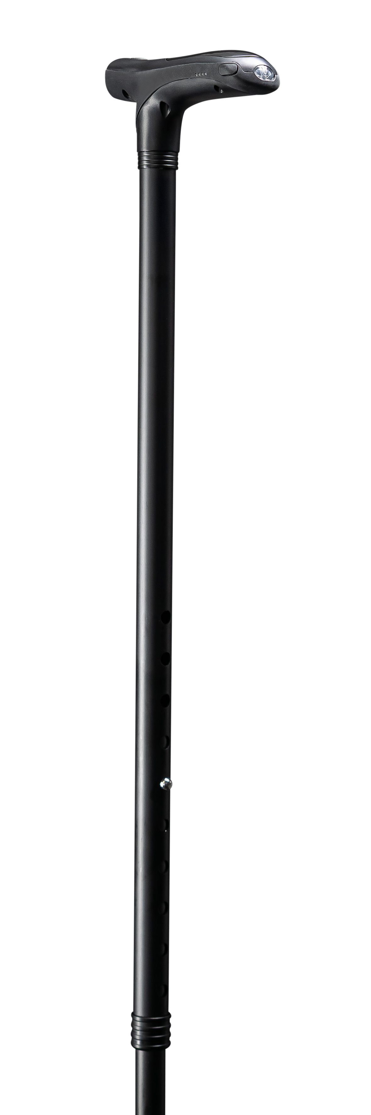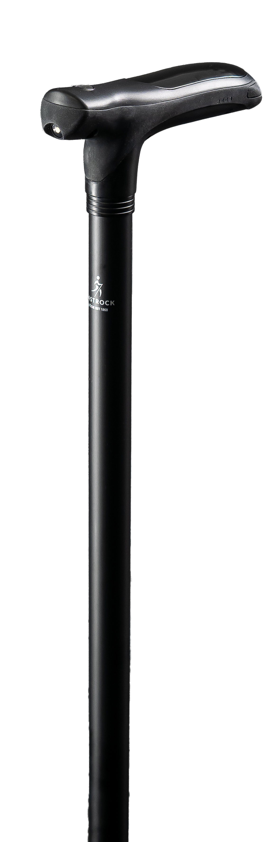 Stabiler Gehstock aus Aluminium mit schwarzem FRITZ-Griff aus Kunststoff. Mit integriertem Wärmepad und Licht für mehr Komfort und Sicherheit. Höhenverstellbarer Schuss mit Satin-Finish. Mit schwarzem Ring und Gummipuffer.