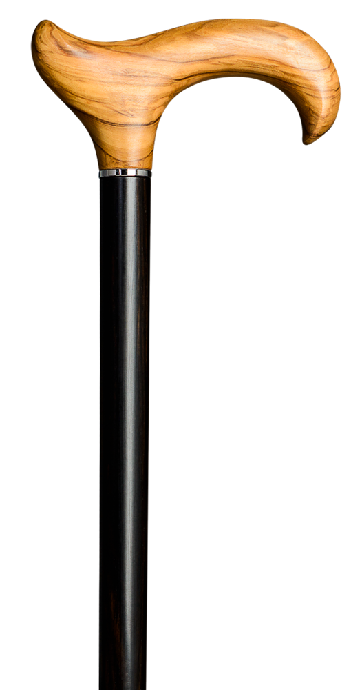 Dieser in aufwendiger Handarbeit hergestellte PREMIUM-Gehstock ist eine Rarität im Hause GASTROCK und vereint hohe Stockmacherkunst mit der Komposition zweier Edelhölzer. Der elegant geschwungene und in naturfarben gemaserte L-DERBY-Griff aus exklusivem und sehr edlem Olivenholz ist für beide Handseiten geeignet und kann durch seine abgerundete Nase bei Bedarf auch schnell über den Arm gehängt werden. Dieser Griff wird aufgesetzt auf einenen stabilen Schuss aus exklusivem, schwarz gemasertem Ebenholz welches durch eine spezielle Glanzpolitur veredelt und versiegelt wird. Weiteres kleines Detail ist der hochwertige Chromring der den Schaft verziert. Ein Schlank-Gummipuffer am Fuß gewährleistet eine bessere Haftung und unterstützt somit den sicheren Gang.