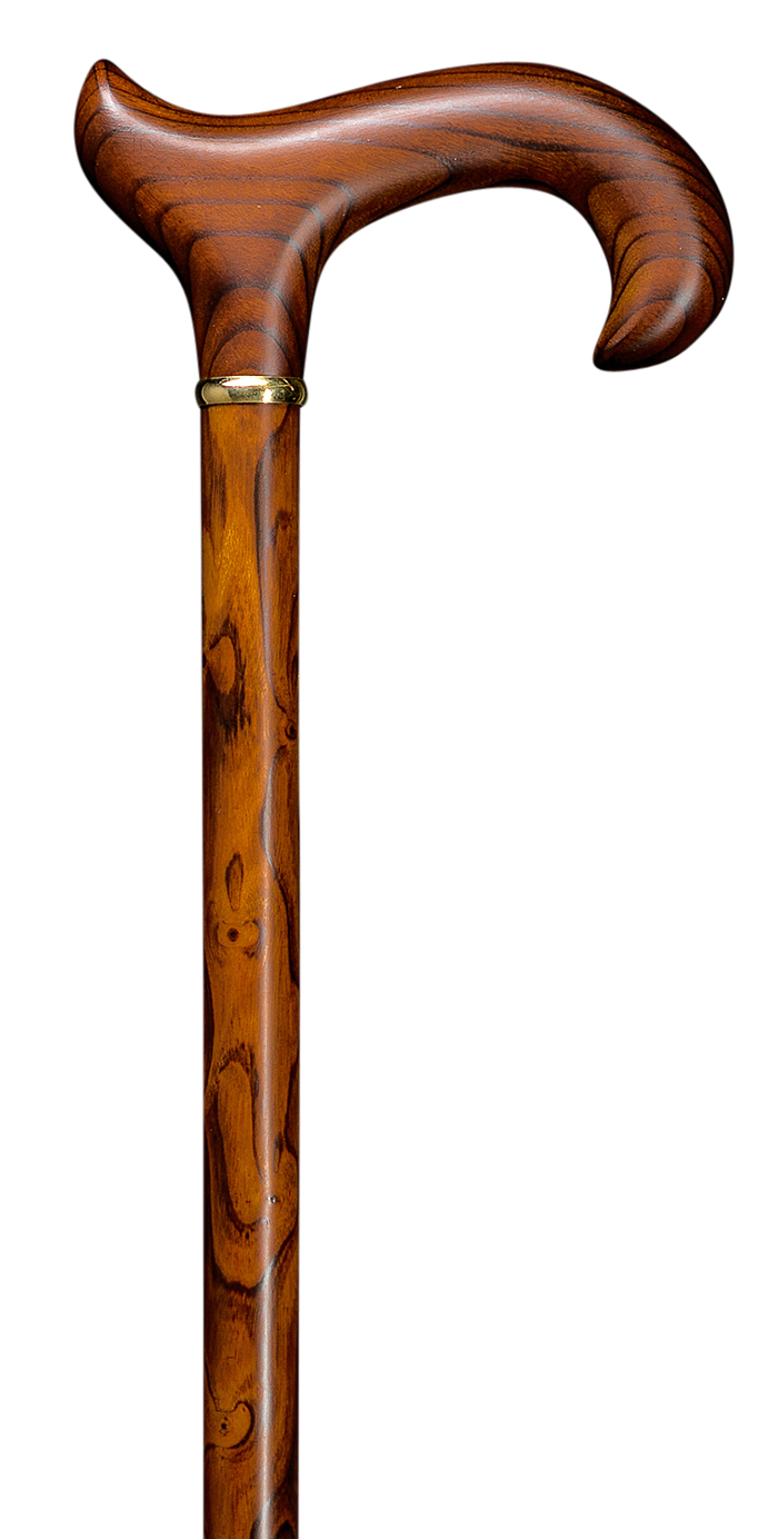 Dieser in aufwendiger Handarbeit hergestellte PREMIUM-Gehstock nach alter Wiener Stockmacherkunst ist zeitlos, doch modern interprtiert. Der elegant geschwungenem L-DERBY-Griff aus echtem Kirschbaumholz in braun ist für beide Handseiten geeignet und kann durch seine abgerundete Nase bei Bedarf auch schnell über den Arm gehängt werden. Dieser Griff wird aufgesetzt auf einenen schlanken Schuss aus exklusivem und auffällig gemasertem Schwarzdornholz, welches kirschbaumfarben und durch eine sezielle Politur veredelt und versiegelt ist. Weiteres kleines Detail ist der hochwertige Messingring der den Schaft verziert. Ein Schlank-Gummipuffer am Fuß gewährleistet eine bessere Haftung und unterstützt somit den sicheren Gang.
