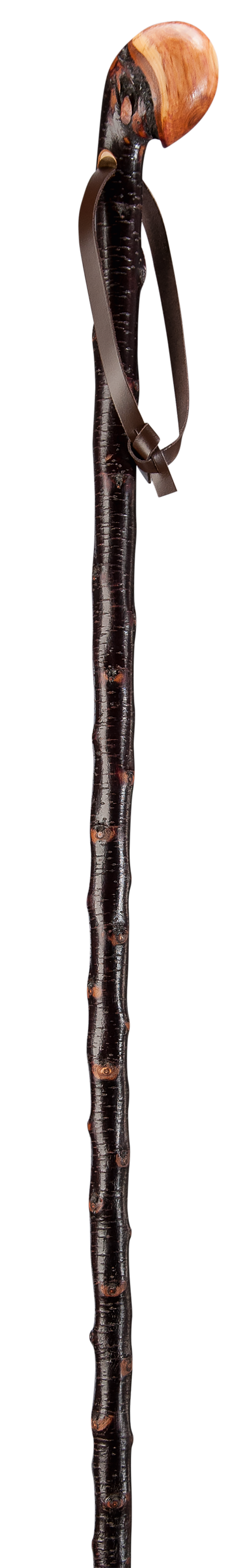 Wurzelstock aus dem seltenen Holz des Schwarzdrorns, in besonderer Handarbeit hergestellter Knauf aus der Wurzl, mit Lederriemen, rindenecht und seidenmatt lackiert. Mit vernickelter Spitzzwinge.