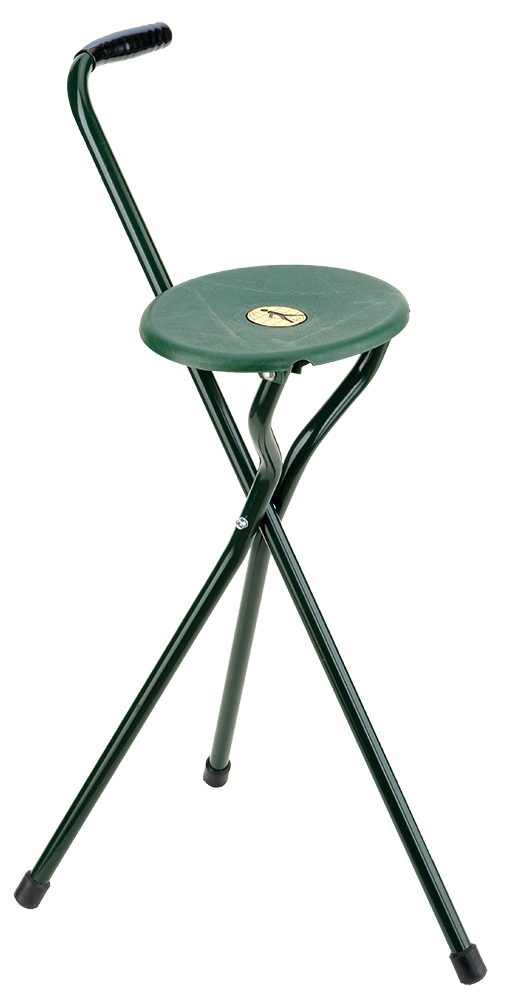 Stabiler Dreibeinstuhl aus Aluminium mit Kunststoffsitz. Flach zusammengeklappt als Gehhilfe verwendbar.