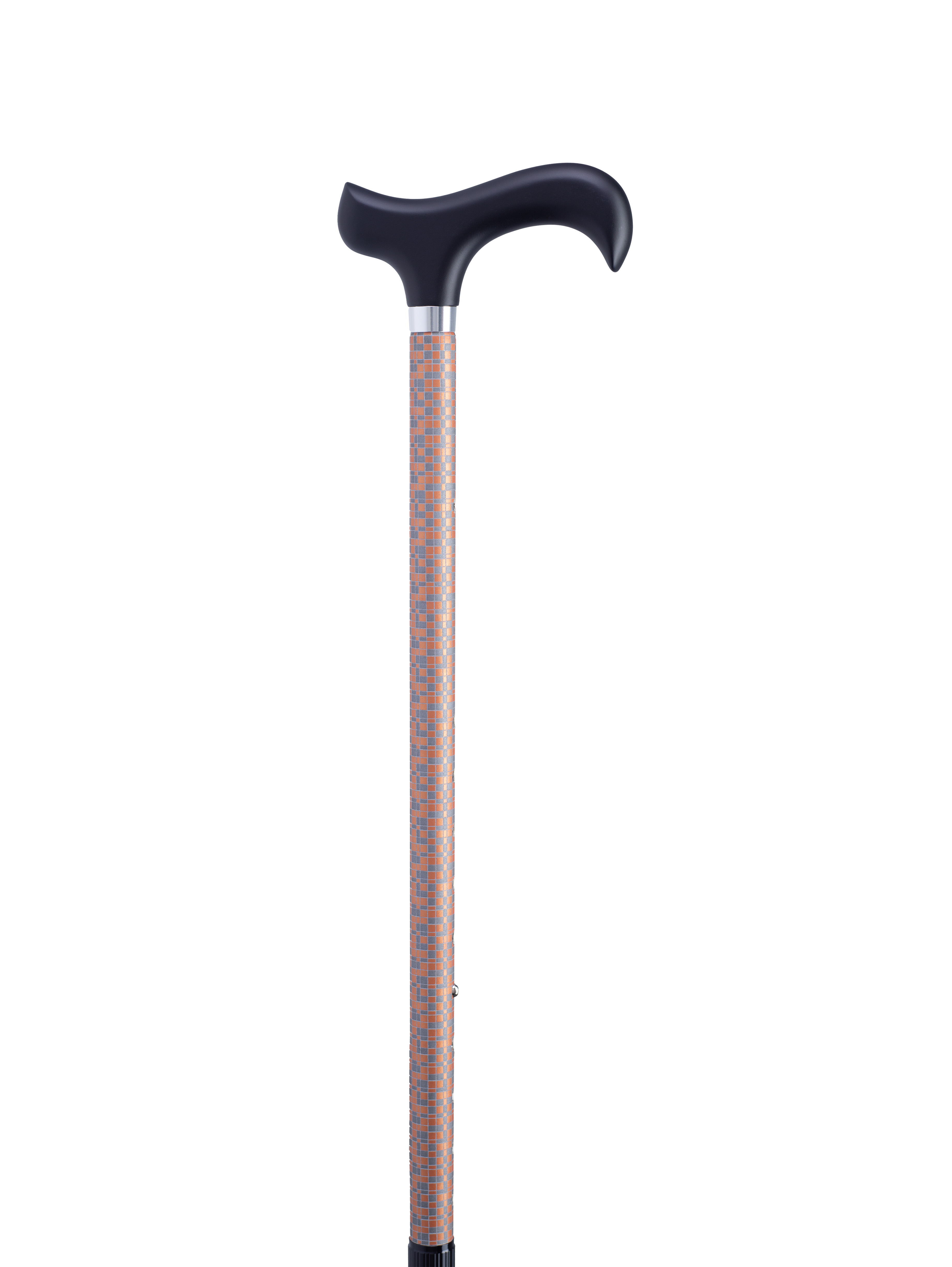 Schlanker Gehstock aus Aluminium mit DERBY-Griff aus Hartholz. Höhenverstellbarer Schuss mit reflektierendem Dekor. Mit Chromring und Gummipuffer.