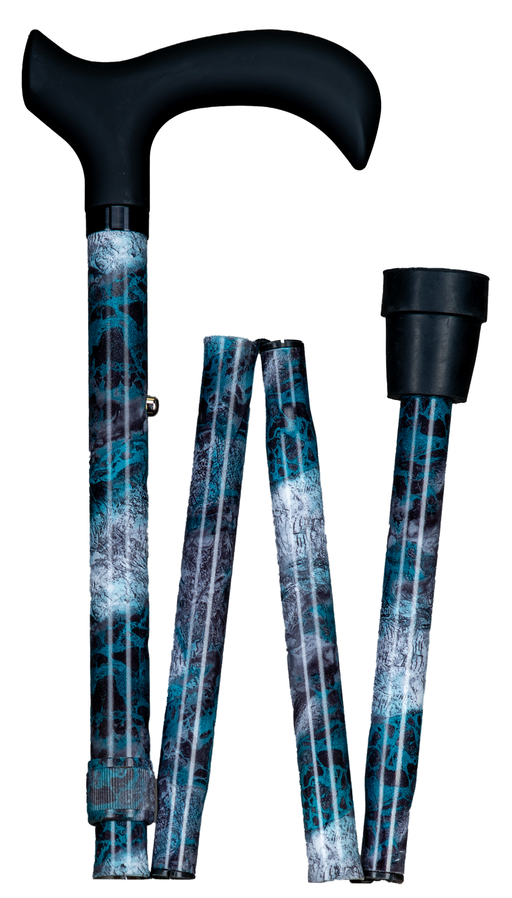 Stabiler Faltstock aus Aluminium mit MELBOURNE-Griff aus Kunststoff mit Soft-Beschichtung. Höhenverstellbarer, farbig eloxierter Schuss mit Satin-Finish. Mit schwarzem Kunststoffring, Halteklammer und Gummipuffer.