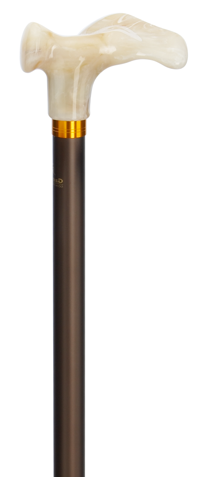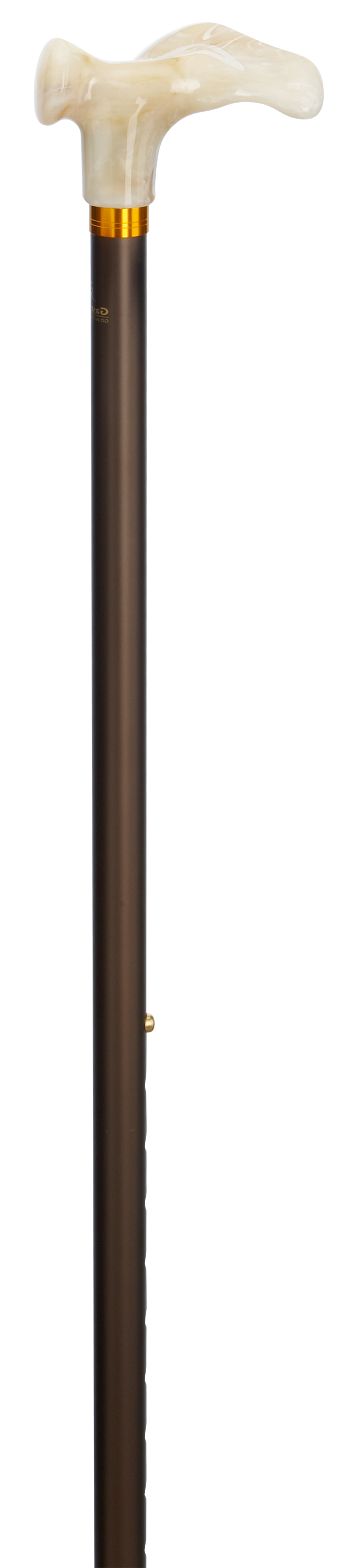 Extralanger Gehstock aus Aluminium mit kleinem, anatomisch geformtem, marmoriertem COMFORT-Griff aus Acetat. Höhenverstellbarer Schuss mit Satin Finish. Mit Messingring und Gummipuffer.