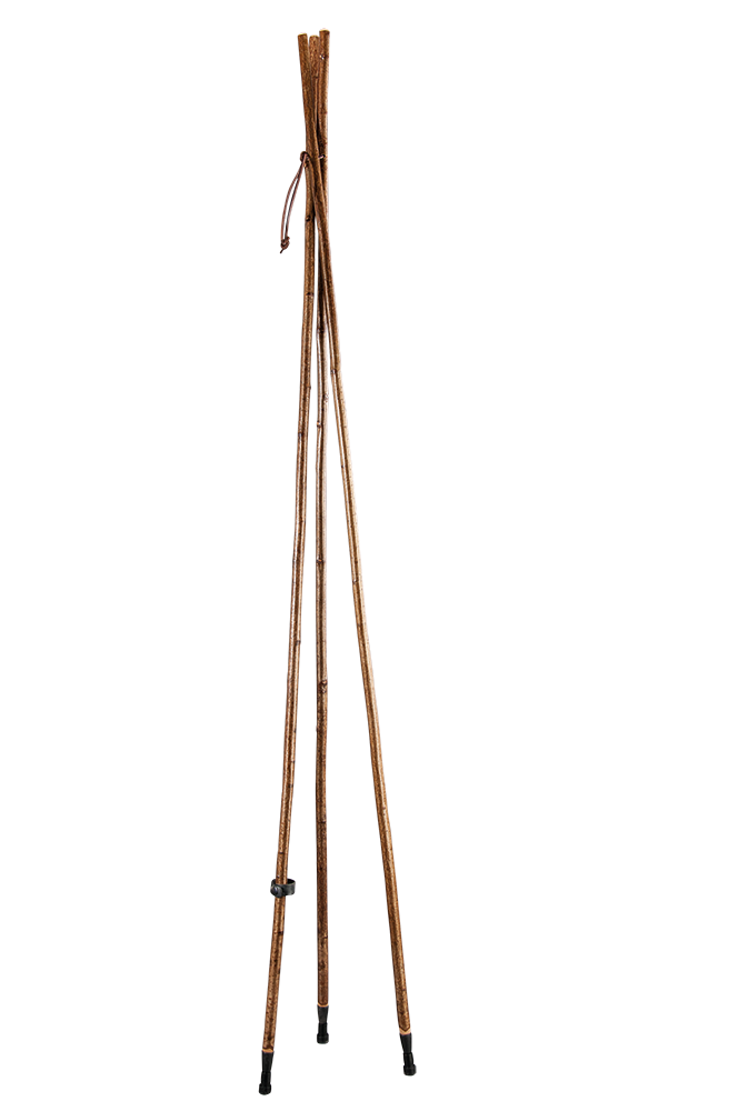 Dreiteiliger Zielstock aus Hasel oder Edelkastanie mit Rinde, Gummiband zum Fixieren, verbunden durch eine Lederschlaufe, nach dem Aufklappen standfest und eine sichere Auflage. Mit Combi-Spike.