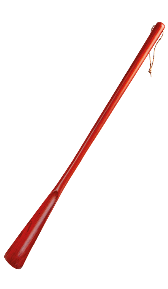 Exklusiver und in einem Stück gearbeiteter Komfort-Schuhanzieher aus hochwertigem, braunem Padouk-Holz mit langem Griff und Lederschlaufe, Länge 60 cm.